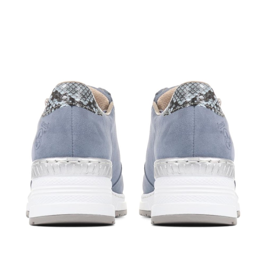 Sommersneaker Mit Auftrieb, Diese Keilabsatz-sneaker Von Rieker Bieten Eleganten Stil Und Gehobenen Komfort. Die Sneaker Mit Keilabsatz Bestehen Aus Glattem Wildleder, Attraktiven Details Mit Schlangenprint Und Dekorativen Schnürsenkeln Und Verfügen über Einen Klassischen Reißverschluss An Der Seite Von Rieker Für Einfaches Anziehen. Diese Bequeme Silhouette Befindet Sich Auf Einer Robusten Und Dennoch Leichten Außensohle Und Ist Mit Einer Schwammigen, Herausnehmbaren Einlegesohle Für Zusätzlichen Halt Versehen.
