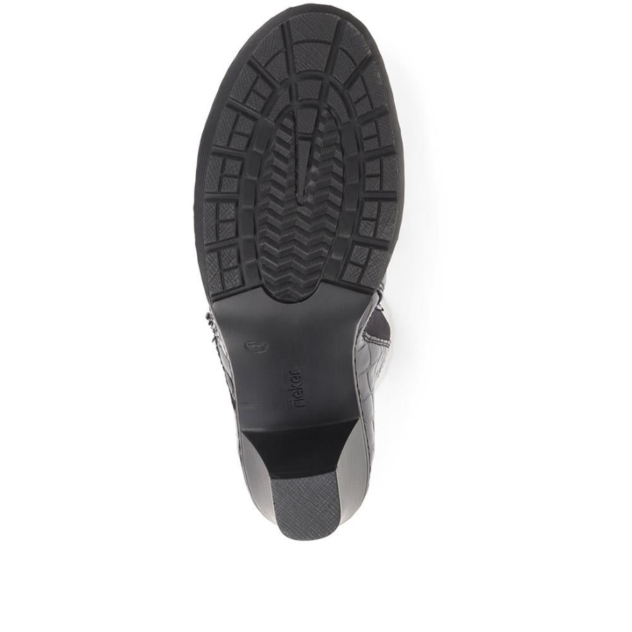Eine Auffällige Wahl Für Elegante Freizeitkleidung, Die Aus Einer Mischung Aus Gewalktem Leder, Schimmernden Und Kroko-Effekt-Einsätzen Besteht. Der Leichte Hosenschuh Sitzt Auf Einem Kurzen Stapelabsatz, Um Ihrem Alltag Einen Subtilen Schub Zu Verleihen, Gefertigt Mit Weichem Futter Und Den Anti-Stress-Eigenschaften Von Rieker, Um Die Flexibilität Ihres Fußes Zu Unterstützen.